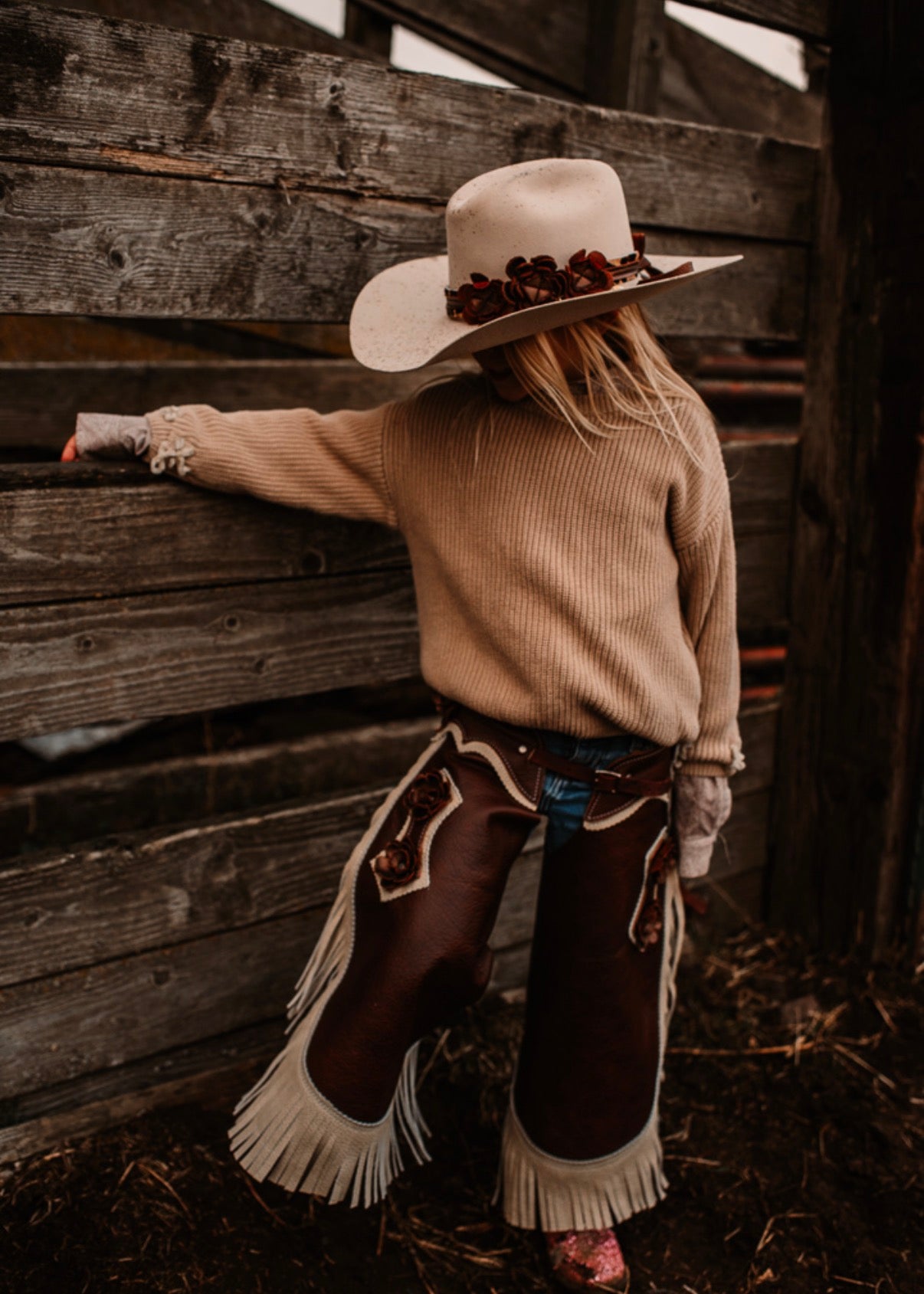 Handmade in Davenport, WA, these chinks bring together the warmth of deep chestnut leather with delicate vanilla fringe and dark metallic floral accents. Autumn Bloom is perfect for the cowgirl who loves a touch of feminine charm while embracing her wild side.