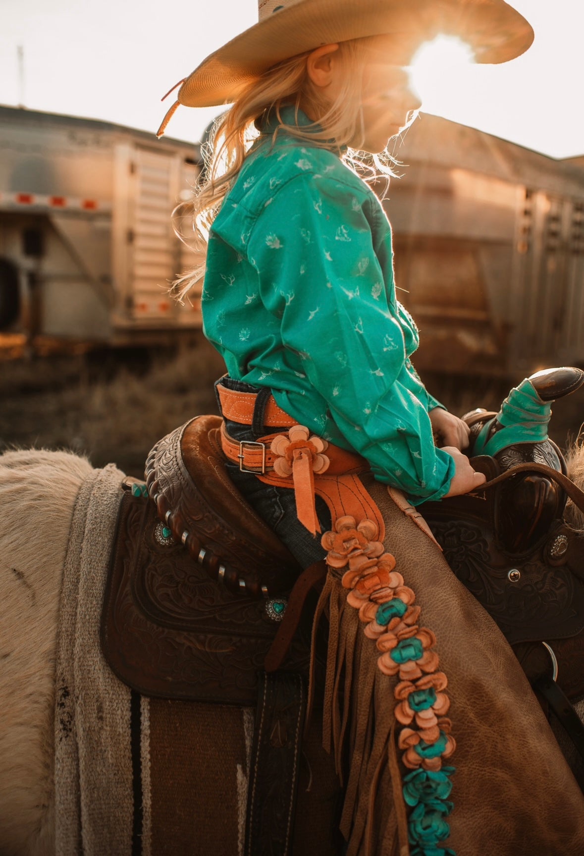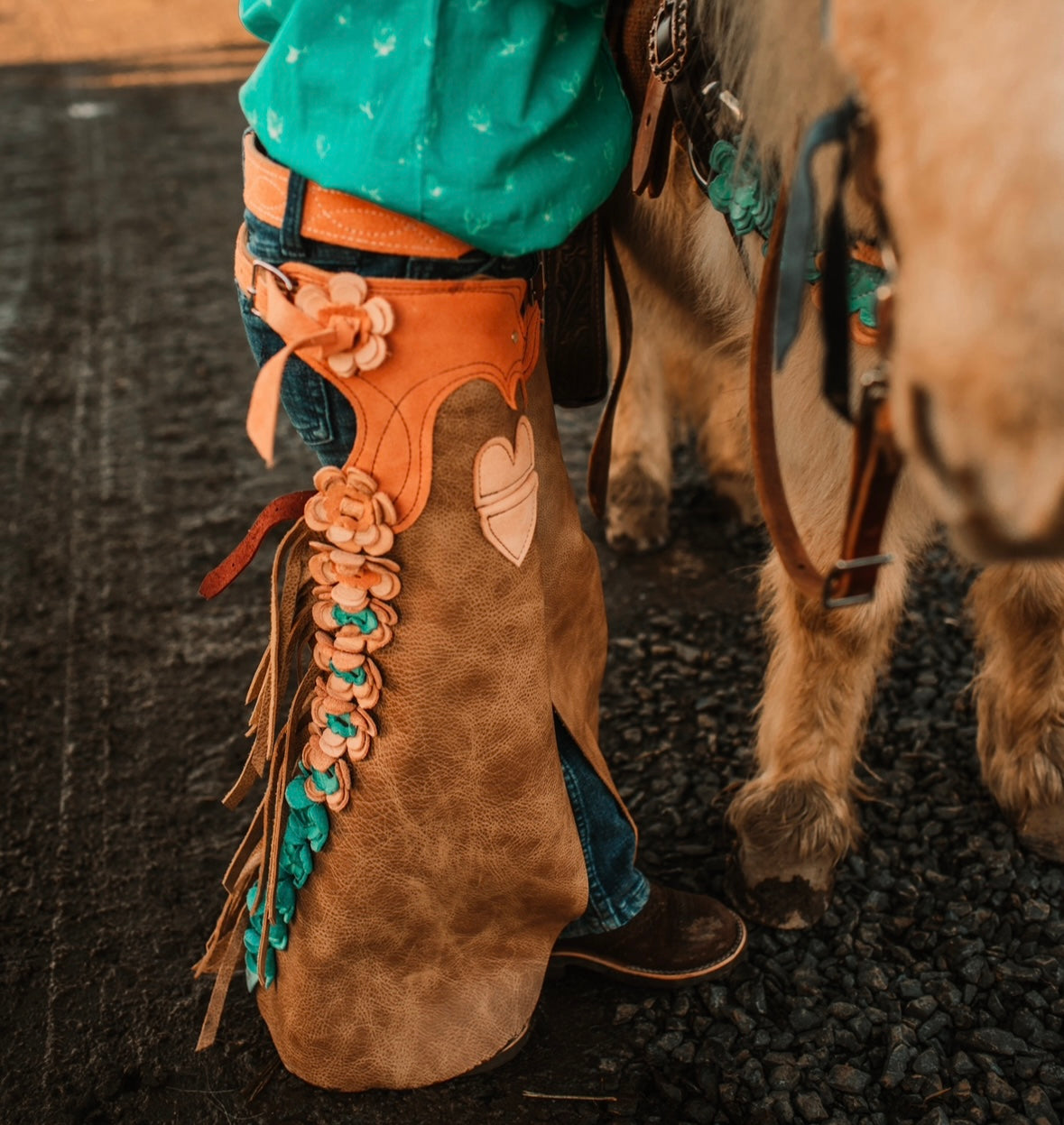 These handmade, high-quality supple leather chaps are perfect for cowgirls looking for style and durability! With a dramatic ombre flower bouquet running down the leg, they are timeless and classy! These are a perfect keepsake, and built to last a lifetime to be passed down generations.