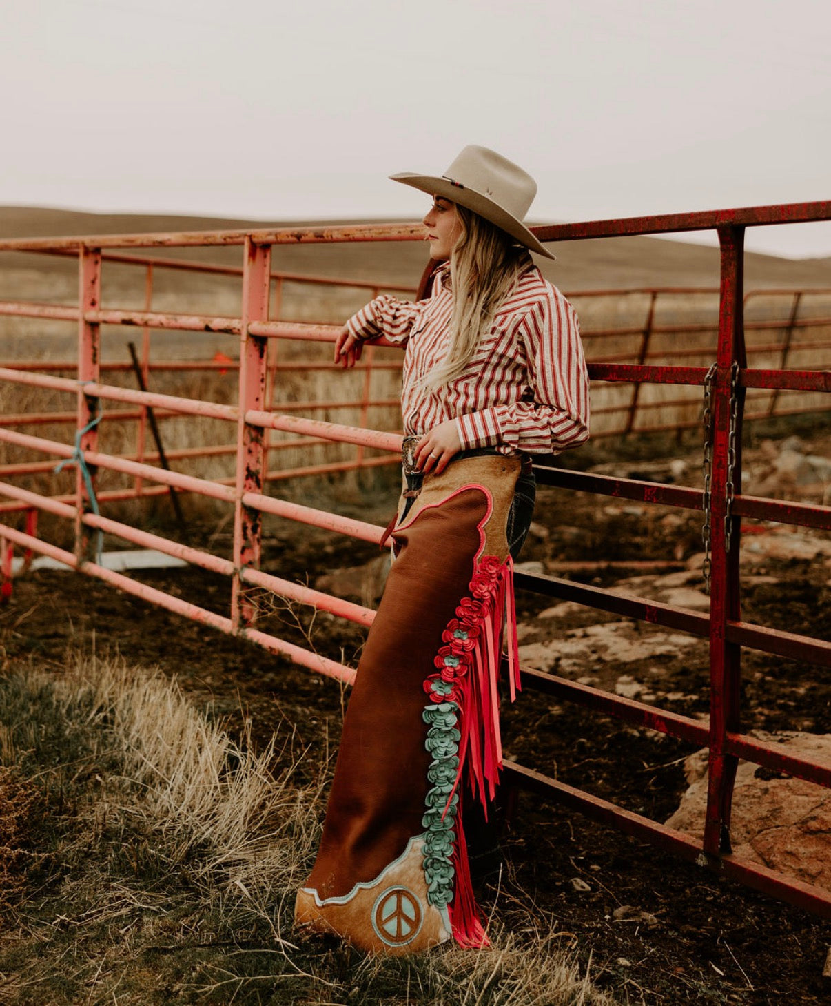 Step into style with the Groovy Prairie Chaps! Designed in a step-in Arizona bell silhouette, these chaps feature a brown base with hot pink and turquoise florals, a playful peace sign at the bottom, and cowhide accents with a convenient pocket. Handmade with care in Davenport, WA, they combine bold Western flair with functional design.