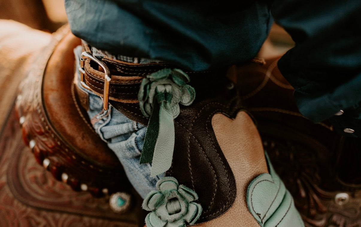 Handmade in Davenport, WA, these chaps are a perfect blend of rugged ranch style and delicate floral charm. Featuring a warm sand base with a stunning floral ombré from chocolate to dusty teal, Ranchland Bloom brings bold color and movement to every step.