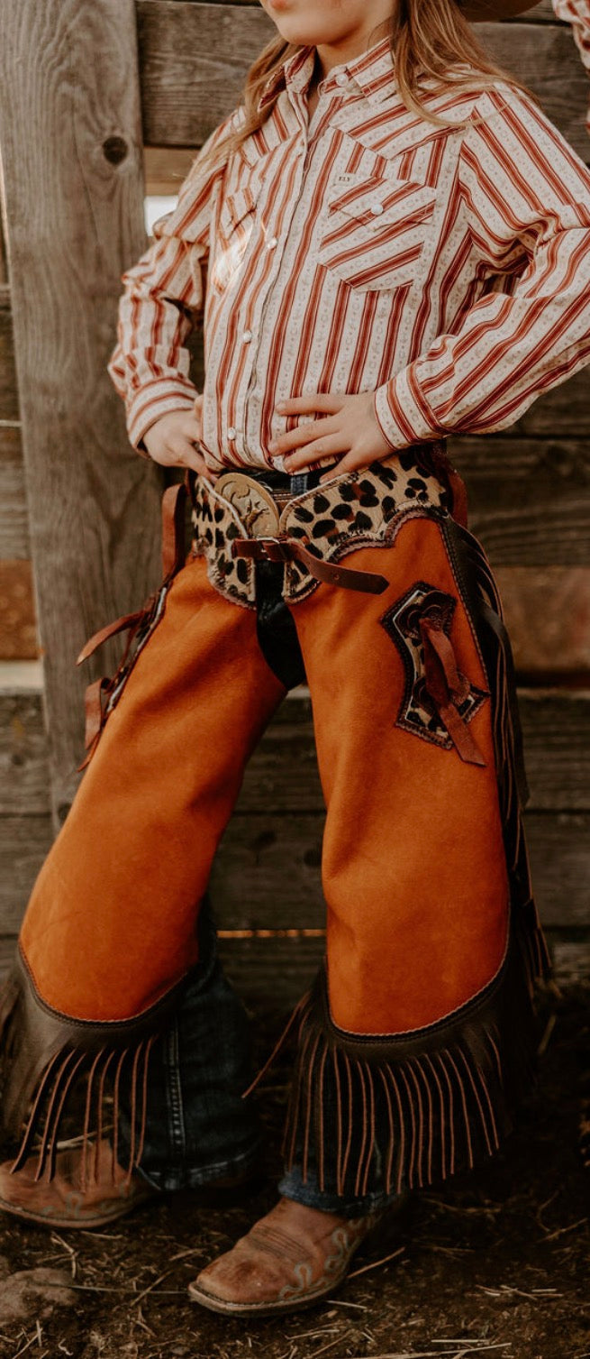 Crafted from buttery-soft leather, these youth chinks bring together rich desert tones and a bold leopard pattern. Finished with sweet heart conchos and partially fringed legs for the perfect mix of punchy and classic. Fully adjustable waist and thigh straps ensure a comfortable, growing-room fit.