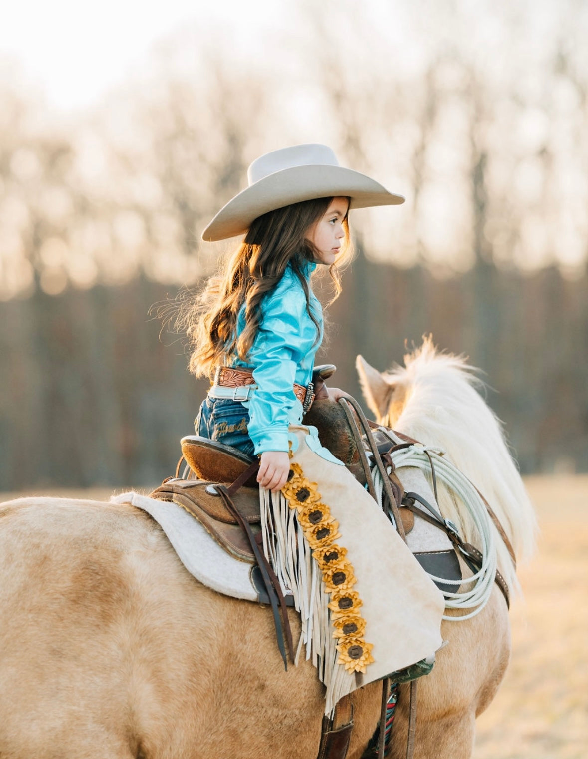These handmade, high-quality supple leather chaps are perfect for cowgirls looking for style and durability! With stunning hand crafted sunflowers running down the leg, they are timeless and classy! These are a perfect keepsake, and built to last a lifetime to be passed down generations.