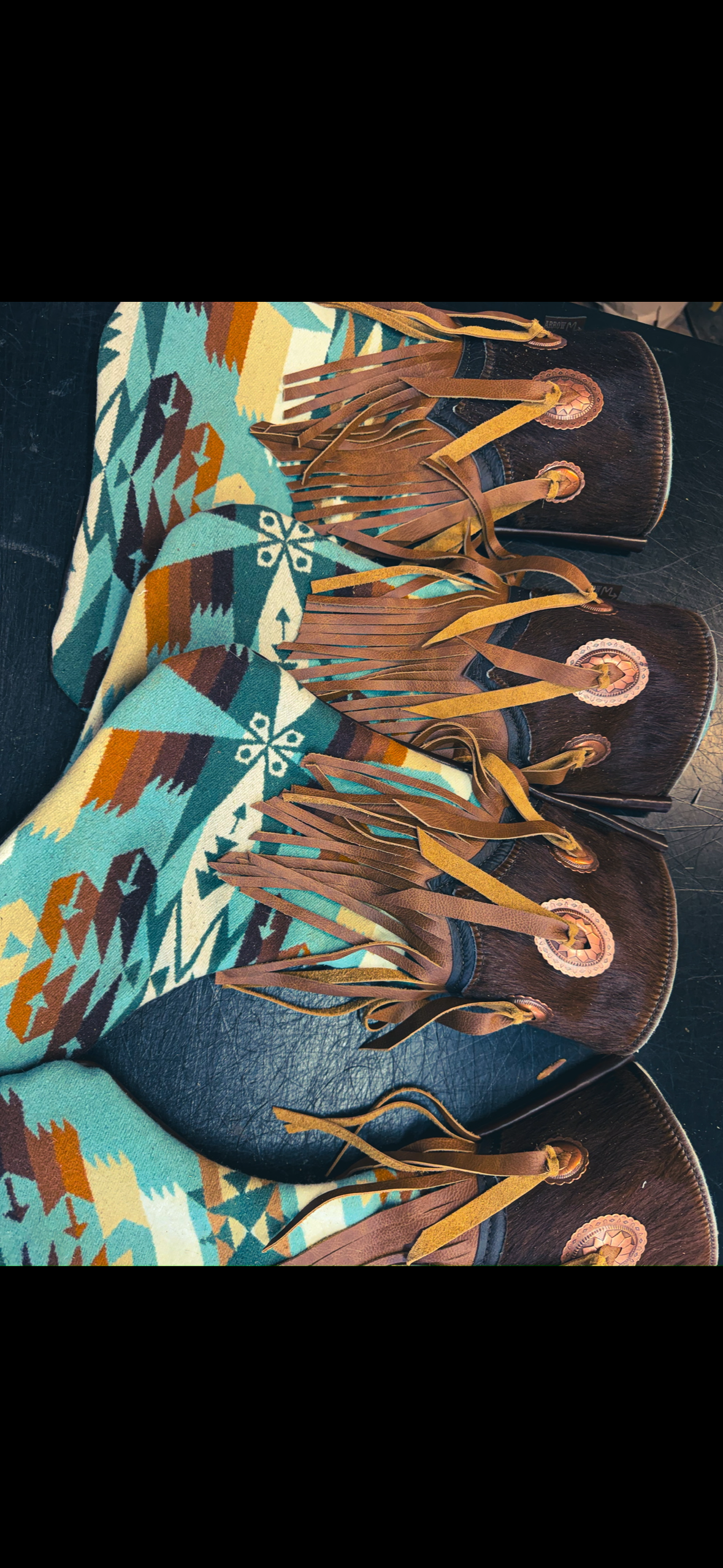Bring a touch of the West to your holiday season with our handmade Tucson Aqua Cowhide Stockings. Each stocking is crafted from premium cowhide, accented with authentic Pendleton® wool, and finished with flowing fringe for that perfect rustic–yet–refined touch.